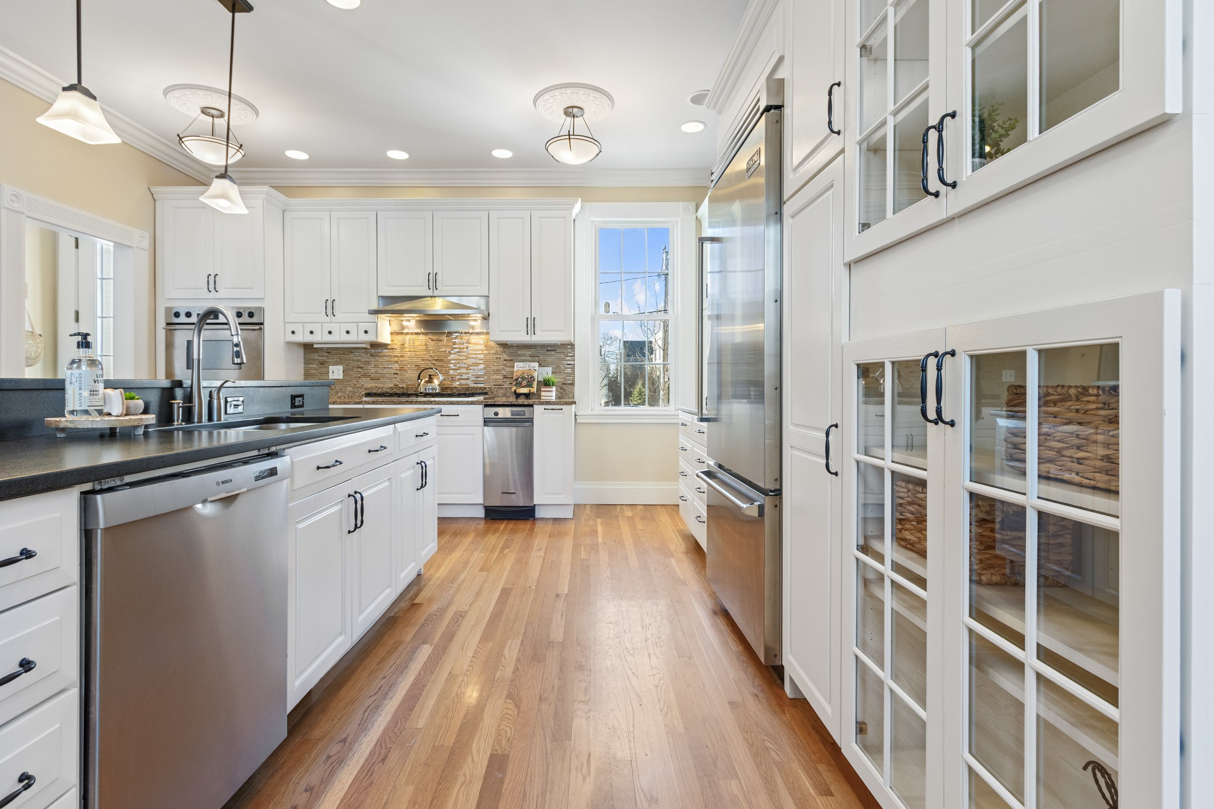 Elegant period details define the home, including crown moldings, a unique, magnificent wide hardwood stairway, and spectacular slate fireplaces that anchor both formal and informal rooms. Soaring ceilings and oversized windows enhance the sense of volume and light throughout, while preserving the timeless character of this stately residence.